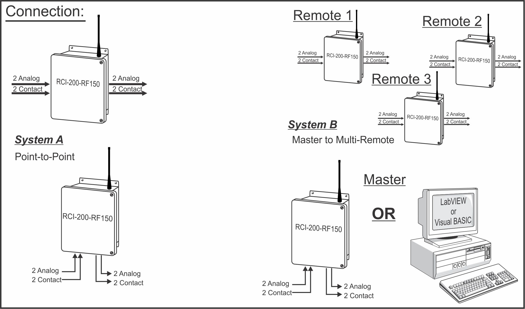 Function: The RCI-200-RF150 is a bi-directional signal communication system that exchanges 2 analog (0-20mA) and 2 dry contact inputs between a master and a remote unit. A complete system consists of one master station and one remote station each with 2 analog inputs, 2 analog outputs, 2 dry contact inputs and 2 'C' relay contact outputs. This means that signals can be retrieved from the remote site for monitoring purposes and that signals can be sent to the remote site for direct control functions.
