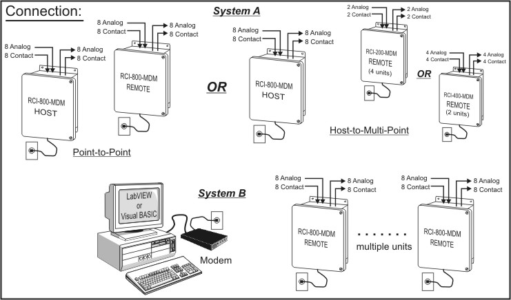 The RCI-800 is a bi-directional remote communication system that exchanges the status of 8 dry contact inputs and 8 analog inputs between a master and remote unit or a PC equipped with a modem. A basic system consists of