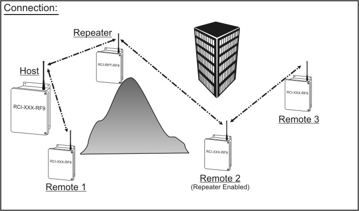 | Function: The RCI-RPT-RF9 is a store and forward radio signal repeater that can be used to extend the distance between a host and its remote(s). The unit receives date from the host and re-transmits it to the remote(s) and vice-versa. Using a repeater can provide access to remote locations that are not in direct line-of-sight with the host.
