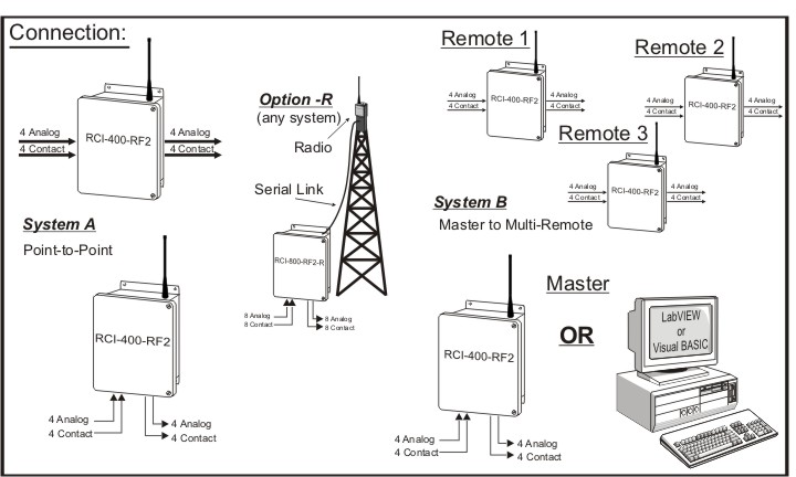 Function: The RCI-400-RF2 is a bi-directional signal communication system that exchanges 4 analog (0-20mA) and 4 dry contact inputs between a master and a remote unit. A complete system consists of one master station and one remote station each with 4 analog inputs, 4 analog outputs, 4 dry contact inputs and 4 'C' relay contact outputs. This means that signals can be retrieved from the remote site for monitoring purposes and that signals can be sent to the remote site for direct control functions.